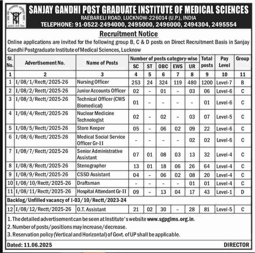 As per the short notice released, the SGPGI is expected to release 1479 vacancies for Group B, C and D posts. The post includes a nursing officer, stenographer, O.T. Assistant, etc. Check below for the SGPGI Nursing Officer Recruitment 2025 short notice.