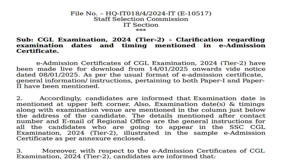 The Staff Selection Commission has released an important notice regarding the SSC Combined Graduate Level Exam Tier 2, scheduled from January 18 to January 20, 2025. As per the notice released, the examination date is mentioned at the upper left corner of the admit card. Candidates can get the details of the exam timings and venue below the candidate's address on the hall ticket.