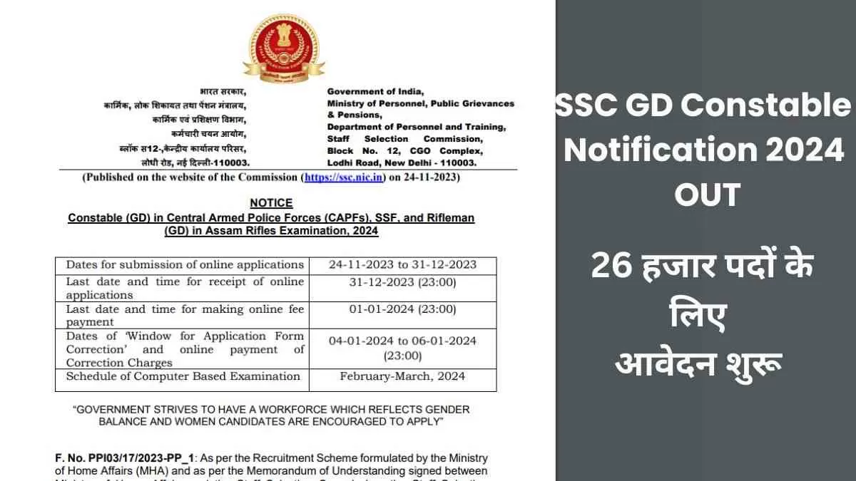 SSC GD Constable Notification 2023: कर्मचारी चयन आयोग वित्त वर्ष 2023-24 के लिए जनरल ड्यूटी कांस्टेबलों के लिए भर्ती प्रक्रिया आयोजित करने जा रहा है। एसएससी जीडी कांस्टेबल भर्ती परीक्षा की अधिसूचना जारी कर दी गई हैI इस बार ये भर्तियाँ 26146 पदों पर की जा रहीं हैंI पदों पर भर्ती के लिए आवेदन प्रक्रिया 24 नवम्बर 2023 से शुरू हो रही हैI एसएससी जीडी 2023 परीक्षा बीएसएफ, सीआरपीएफ, सीआईएसएफ, आईटीबीपी, एसएसएफ, एसएसबी, एनआईए में कांस्टेबल और असम राइफल्स (एआर) में राइफलमैन के पद के लिए उम्मीदवारों का चयन करने के लिए आयोजित की जाएगी।