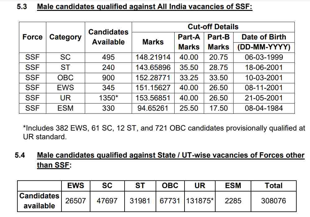 एसएससी जीडी परीक्षा में कुल 351176 उम्मीदवारों को फिजिकल टेस्ट के लिए बुलाया गया है। पुरुष वर्ग में 308076 उम्मीदवारों ने तो महिलाओं में 38328 उम्मीदवारों ने फिजिकल टेस्ट के लिए सफलता प्राप्त की है। सफल पुरुष उम्मीदवारों में EWS के 26507, ST के 47697, OBC के 31981 और ESM के 2285 अभ्यर्थी हैं। जबकि अनारक्षित वर्ग के 131875 अभ्यर्थी सफल हुए हैI सफल महिला उम्मीदवारों में EWS की 3096, SC 5984, ST के 3696, OBC के 8410 और ESM के 4 अभ्यर्थी हैं। जबकि 17138 अभ्यर्थी अनारक्षित वर्ग की हैं।