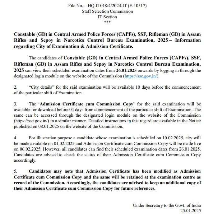 As per the official notification, the SSC GD exam city details will be available 10 days before the exam date, enabling candidates to plan their travel in advance. The ‘Admission Certificate cum Commission Copy’ will be accessible for download 4 days before the scheduled exam date. For instance, if a candidate’s exam is on 10th February 2025, the exam city details will be released on 2nd February, and the admit card will be available on 6th February 2025. Go through the official notice provided below.