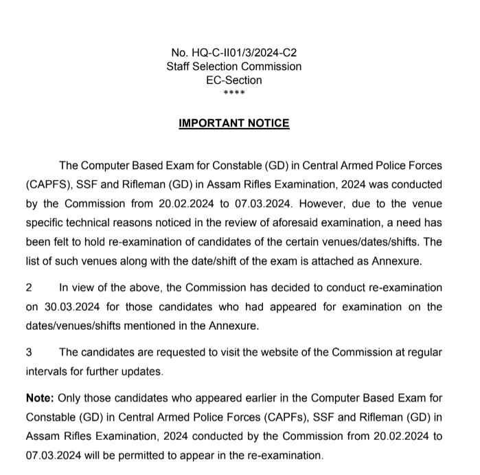 उम्मीदवारों से अनुरोध है कि वे आगे की अपडेट के लिए नियमित अंतराल पर आयोग की वेबसाइट देखते रहें। नोट: केवल वे उम्मीदवार जो पहले केंद्रीय सशस्त्र पुलिस बलों (सीएपीएफ), एसएसएफ में कांस्टेबल (जीडी) और असम राइफल्स परीक्षा, 2024 में कांस्टेबल (जीडी) के लिए कंप्यूटर आधारित परीक्षा में उपस्थित हुए थे, जो आयोग द्वारा 20.02.2024 से 07.03 तक आयोजित की गई थी। 2024 को दोबारा परीक्षा में शामिल होने की अनुमति दी जाएगी।”