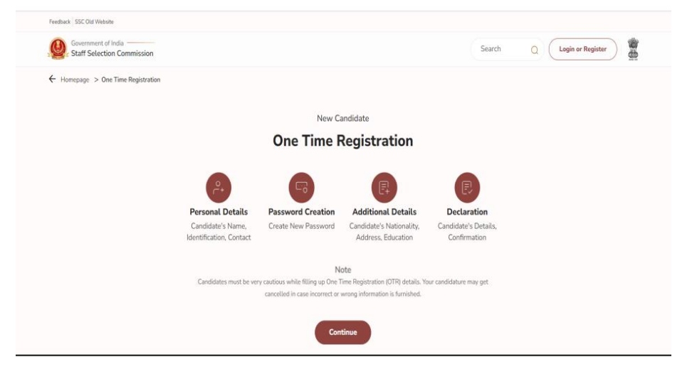 मैन पेज पर, आपको 'One-Time Registration' फॉर्म भरने के चरण मिलेंगे। आगे बढ़ने और व्यक्तिगत विवरण स्क्रीन तक पहुंचने के लिए 'Continue' पर क्लिक करें।