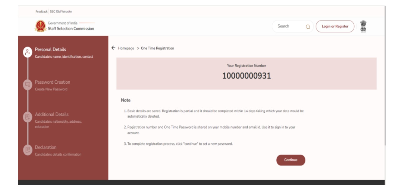 शेष रजिस्ट्रेशन को अंतिम रूप देने के लिए, उपयोगकर्ता 'Continue' पर क्लिक कर सकते हैं, जो उन्हें निम्नलिखित स्क्रीन में प्रदर्शित लॉगिन पेज पर ले जाएगा। यदि उपयोगकर्ता अगले दिन पंजीकरण पूरा करना चुनते हैं, तो वे वेबसाइट हेडर पर 'Login or Register' बटन पर क्लिक करके लॉग इन कर सकते हैं। रजिस्ट्रेशन संख्या उपयोगकर्ता नाम के रूप में कार्य करती है, और स्वचालित रूप से उत्पन्न पासवर्ड उपयोगकर्ता के मोबाइल पर भेजा जाता है, और ईमेल का उपयोग प्रारंभिक लॉगिन के लिए किया जाता है। पहली बार लॉगिन करने पर, उपयोगकर्ताओं को अपना पासवर्ड बदलने के लिए प्रेरित किया जाएगा।