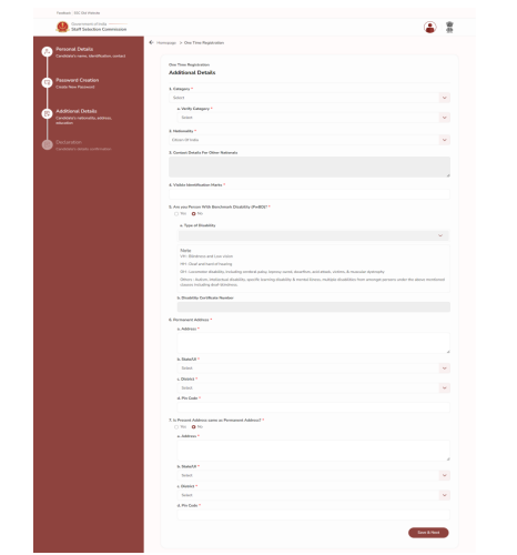 अतिरिक्त विवरण पूरा करने के लिए, उपयोगकर्ताओं को अपनी श्रेणी (एस नंबर -1), राष्ट्रीयता (एस नंबर -2) के बारे में जानकारी प्रदान करनी होगी, और, यदि राष्ट्रीयता 'भारत के नागरिक' के अलावा अन्य है, तो 'अन्य नागरिकों के लिए संपर्क विवरण' सक्षम करें। यदि राष्ट्रीयता 'भारत का नागरिक' है तो उपयोगकर्ताओं को स्थायी और वर्तमान पते का विवरण भरना होगा, या यदि राष्ट्रीयता भिन्न है तो इन क्षेत्रों को Disabled करना होगा। इसके अतिरिक्त, उपयोगकर्ताओं को यदि लागू हो तो विकलांगता प्रमाणन संख्या के साथ visible identification mark (एस नंबर -4) और बेंचमार्क विकलांगता (एस नंबर -5) के बारे में जानकारी प्रदान करनी चाहिए। यदि राष्ट्रीयता '' है, तो उपयोगकर्ताओं को पंजीकरण प्रक्रिया के अंतिम भाग में आगे बढ़ने के लिए डेटा को सेव करते हुए, स्थायी और वर्तमान पते का विवरण भरना चाहिए।