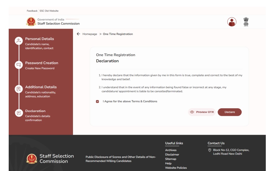 घोषणा को ध्यान से पढ़ने के बाद, उपयोगकर्ताओं को "Preview OTR" 'मैं सहमत हूं' की जांच करनी चाहिए, फिर घोषणा जमा करने के लिए 'Declare' पर क्लिक करें। सफल सबमिशन पर, उपयोगकर्ताओं को डैशबोर्ड पर पुनः निर्देशित किया जाएगा।