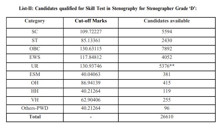 Based on the performance of the candidates in the Computer Based Examination, 9345 candidates have provisionally qualified for appearing in the Skill Test for the post of Stenographer Grade ‘C’ and 26610 candidates have provisionally qualified for appearing in the Skill Test for the post of Stenographer Grade ‘D’.