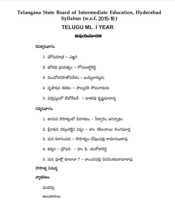 Telangana Board 1st Year Telugu (ML) Syllabus 2024-25