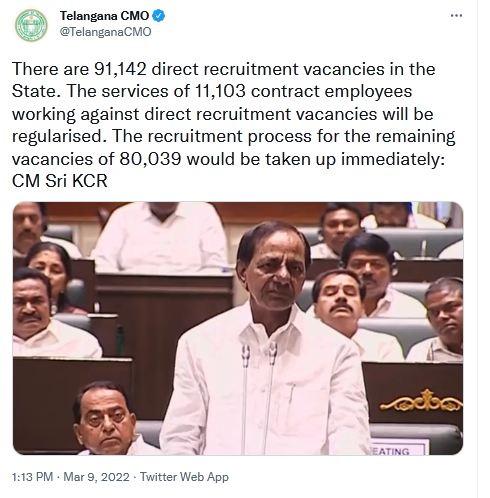 The chief minister also explained that till now 1,33,942 vacancies have been already filled up by the TRS government in the last few years and the remaining 22,312 posts are under the recruitment process.
