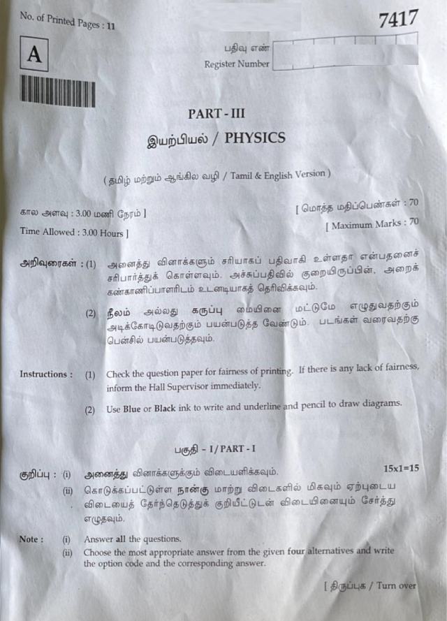 TN SSLC Class 12 Physics Question Paper Pattern 2024