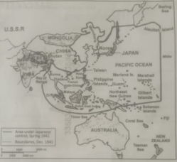 The map shows the extent of Japanese control in Asia and the Pacific region during World War II. It highlights areas occupied by Japan by December 1941 and further expansion by spring 1942.