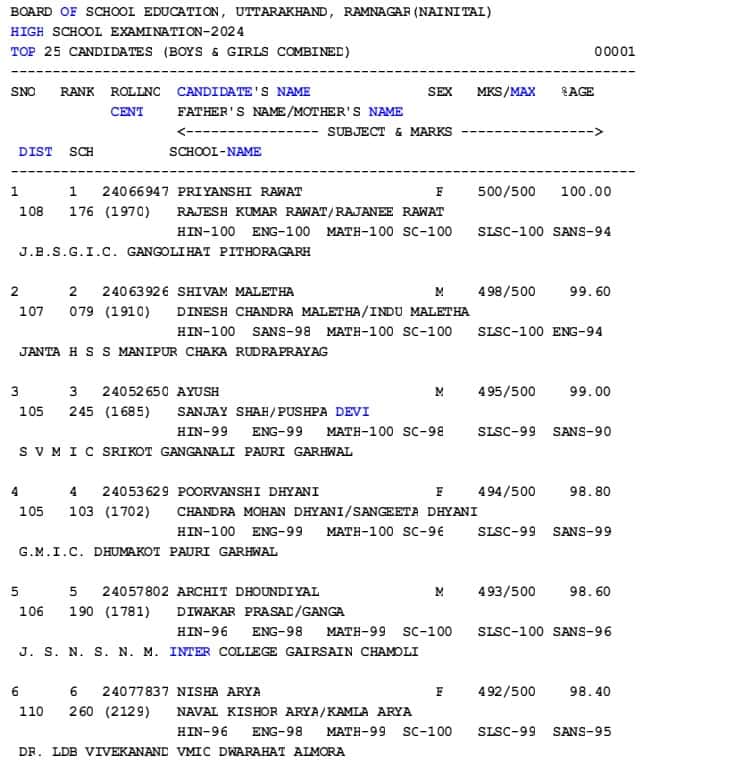 Uk Board की ओर से आयोजित 10वीं बोर्ड परीक्षा परिणाम में स्कोरकार्ड में अलग-अलग विवरण शामिल होते हैं। बोर्ड की ओर से जारी टॉपर्स लिस्ट में आप टॉपर का नाम, स्कूल का नाम, रैंक, पर्सेंटेज और कुल अंक भी देख सकते हैं।
