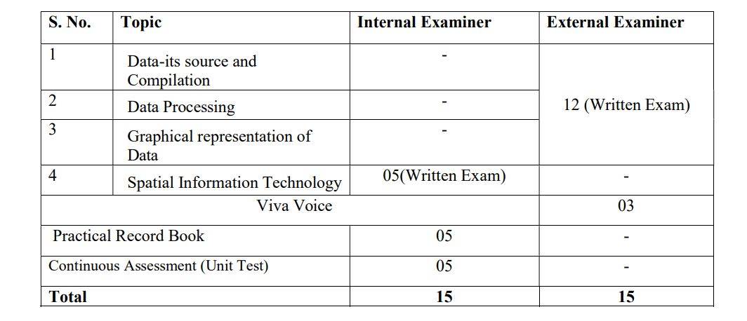 A practical file must be prepared by students covering all the topics prescribed in the practical syllabus. The file should be completely handwritten with a cover page, index page and acknowledgment. All statistical diagrams and maps should be drawn neatly with appropriate headings, scale, index etc. Data to draw statistical diagrams can be taken from the NCERT text book or Census. The practical file will be assessed by the internal examiner at the time of practical examinations. A written exam of 12 marks will be conducted by external examiner and written exam of 5 marks will be conducted by internal examiner based on the above given practical syllabus on the day of the practical exam. Viva will be conducted based on practical syllabus only.