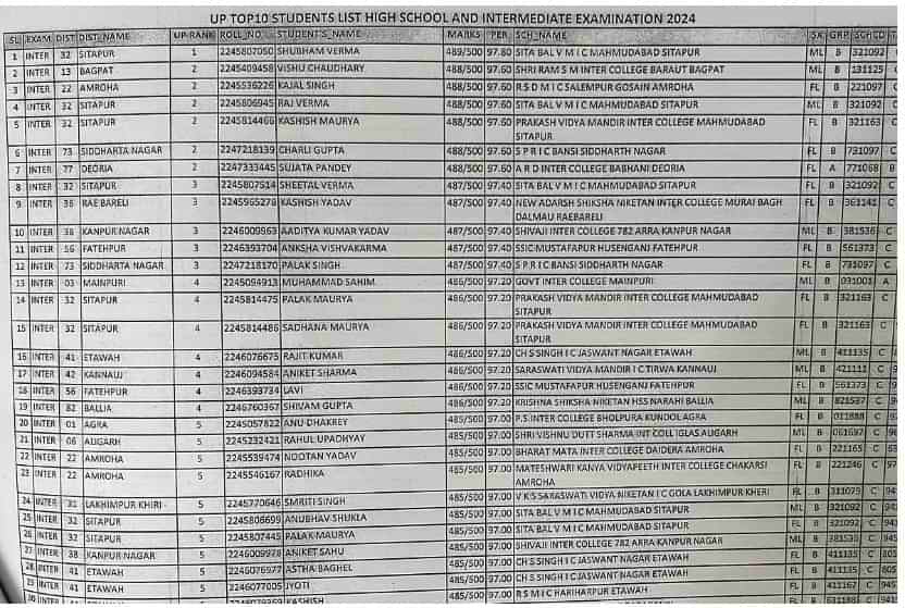 यूपी बोर्ड कक्षा 10वीं टॉपर्स 2024 के नाम और उनके द्वारा हासिल किये गए नंबर और उनकी परसेंटेज नीचे टेबल के माध्यम से प्रस्तुत किया जायेगा.