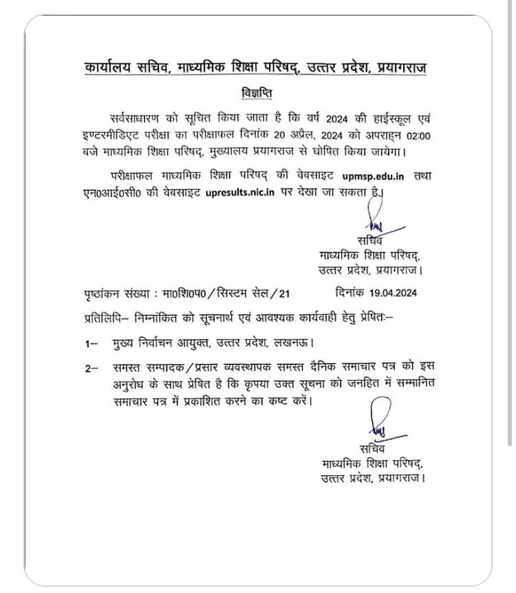 यूपी बोर्ड 10वीं और 12वीं का रिजल्ट 20 अप्रैल, 2024 को दोपहर 2 बजे जारी किया जाएगा। यह जानकारी उत्तर प्रदेश माध्यमिक शिक्षा परिषद (UPMSP) द्वारा आधिकारिक तौर पर घोषित की गई है। आप अपना रिजल्ट UPMSP की आधिकारिक वेबसाइट पर देख सकेंगे।