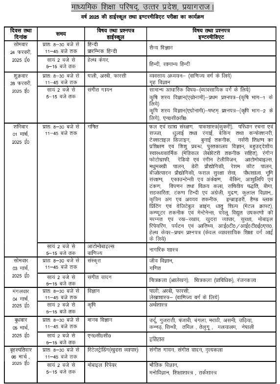 Direct Link: Download the Official PDF for UP Board Class 12 Time Table 2025