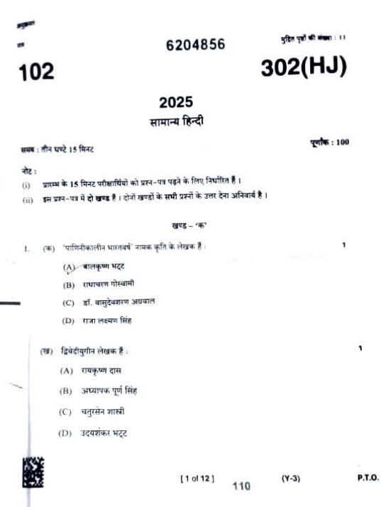 यूपी बोर्ड कक्षा 12 हिंदी प्रश्न पत्र 2025 PDF