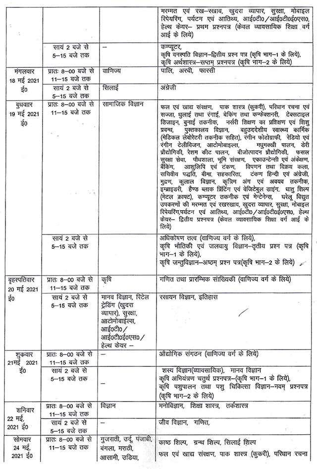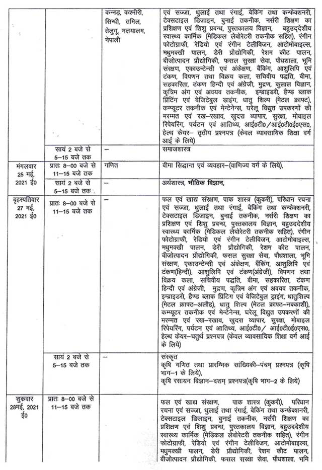 | सायं 2:00 बजे से 05:15 बजे तक | कृषि भास्य विज्ञान (एग्रोनामी)(397)-शश्ठम प्रश्नपत्र (कृश भाग-2 के) काश्टशिल्प, (368) ग्रन्थशिल्प(388) तथा सिलाई(370)—प्रथम प्रश्नपत्र फल एवं खाद्य संरक्षण, (406) पाकभास्त्र (411) परिधानरचनाएवं (416) ध्रुलाई तथा रंगाई, (421) बेंकिग तथा कन्फेक्शनरी, (428) टेक्सटाईल डिजाईन, (431) बुनाई तकनीक, (438) नर्सरी शिक्षण का प्रशिक्षण एवं शिशु प्रबन्ध, (441) पुस्तकालय विज्ञान (448) बहुउददेशीय स्वास्थ्यकार्मिक (मेडिकल लेबोरेटरी तकनीक सहित),(451) रंगीन फोटोग्राफी (456) रेडियो एवं रंगीन टेलीवीजन, (481) आटोमोबाइल्स, (468) मधुमक्खी पालन, (471) डेरी प्रोद्योगिकी, (478) रेशम कीट पालन, (481) बीजोत्पादन प्रोद्यौगिकी, (486) फसल सुरक्षा सेवा. (491) पौधशाला, (496) एकाउन्टेन्सी एवं अंकेक्षण, (506) बैंकिग, (511) आशुलिपि एवं टंकण, (516) विपणन तथा विक्रय कला, (523) सचिवीय पद्धति, (528) सहकारिता, (538) टकण हिन्दी एवं अंग्रेजी, (543) मुद्रण, (548) इम्ब्राइडरी (559) हैण्ड ब्लाक प्रिंटिग एवं वेजिटेबिल ड्राइंग, (564) धातु शिल्प (मेटेल क्राफ्ट), (569) कम्प्यूटर तकनीक एवं मेन्टेनेन्स, (576) घरेलू विद्युत उपकरणों की मरम्मत एवं रखरखाव(581) -प्रथम प्रश्नपत्र (केवल व्यवसायिक शिक्षा वर्ग आई को लिये) | |