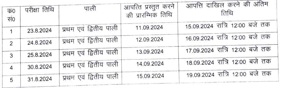जारी नोटिस के अनुसार, " उत्तर प्रदेश पुलिस भर्ती एवं प्रोन्नति बोर्ड द्वारा आरक्षी नागरिक पुलिस के पदों पर सीधी भर्ती-2023 की दिनांक 23, 24, 25 अगस्त तथा 30, 31 अगस्त, 2024 को सम्पन्न लिखित परीक्षा के सभी 10 पालियों के प्रश्न पत्रों तथा उत्तर कुंजी बोर्ड की वेबसाइट https://uppbpb.gov.in/ पर निम्नानुसार प्रदर्शित की जायेगीः-