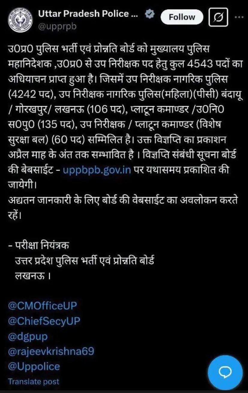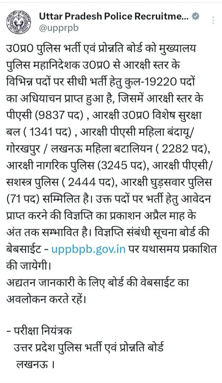 UP Police Vacancy 2025: The Uttar Pradesh Police Recruitment and Promotion Board (UPPRPB) has announced 26596 vacancies for Constable, Sub-Inspector (SI), and Jail Warder posts through a tweet on March 27. The UP Police Bharti 2025 Notification PDF is expected to be released by the end of April 2025 on the official website uppbpb.gov.in. Out of the total vacancies, 19,220 are for Constable, 4,543 for Sub-Inspector (SI), and 2,833 for Jail Warder posts. Candidates who have passed Class 12th can apply for the UP Police Bharti, but the eligibility criteria vary for each post. The selection process will also differ based on the role applied for.