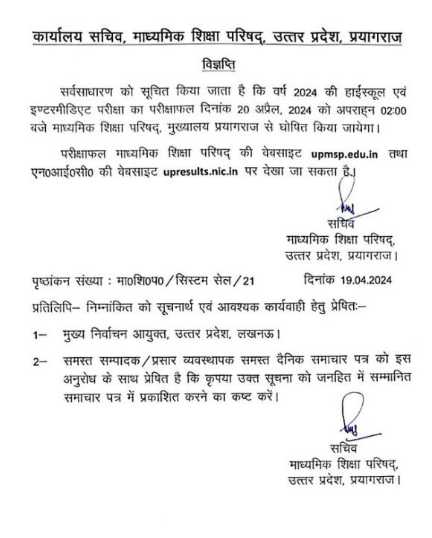 - यूपीएमएसपी 20 अप्रैल, 2024 को यूपी 2024 बोर्ड परिणाम घोषित करेगा।