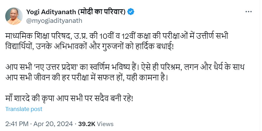UPMSP UP Board 10th, 12th Result 2024 मुख्यमंत्री ने दी टॉपर्स को बधाई