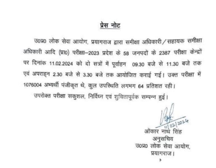 As per the official notice released by the UPPSC, the exam was conducted at 2387 centres in 58 districts of Uttar Pradesh in two shifts i.e. 9:30-11:30 and 2:30-3:30, and the number of candidates who attempted the paper was 1076004.