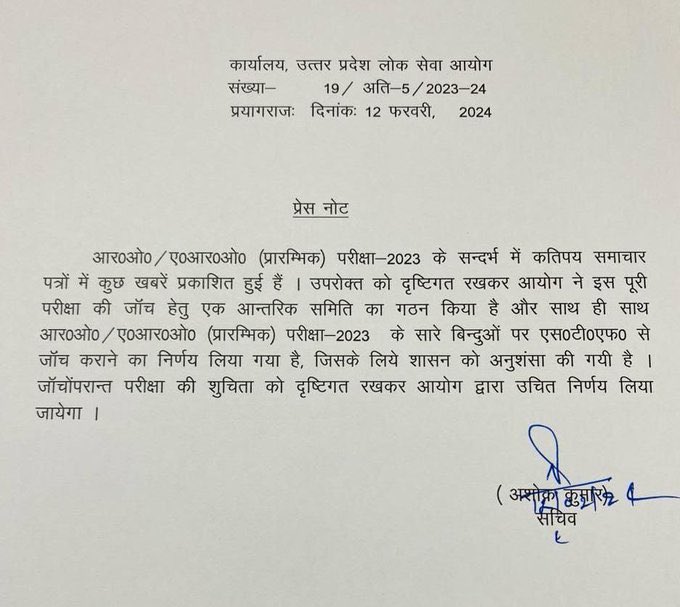 आरओ/एआरओ परीक्षा-2023 की कथित उत्तर कुंजी की रिपोर्ट सोशल मीडिया पर प्रसारित होने के बाद, यूपीपीएससी ने 12 फरवरी को सरकार से सिफारिश की कि यूपी आरओ पेपर लीक मामले में एसटीएफ को जांच की जिम्मेदारी सौंपी जाये और इसके लिए एक आंतरिक समिति का गठन किया जाए। यूपी आरओ एआरओ परीक्षा 11 फरवरी को 58 जिलों के 2387 केंद्रों पर आयोजित की गई थी जिसमें कुल 10,76,004 उम्मीदवारों में से 64% ने भाग लिया।