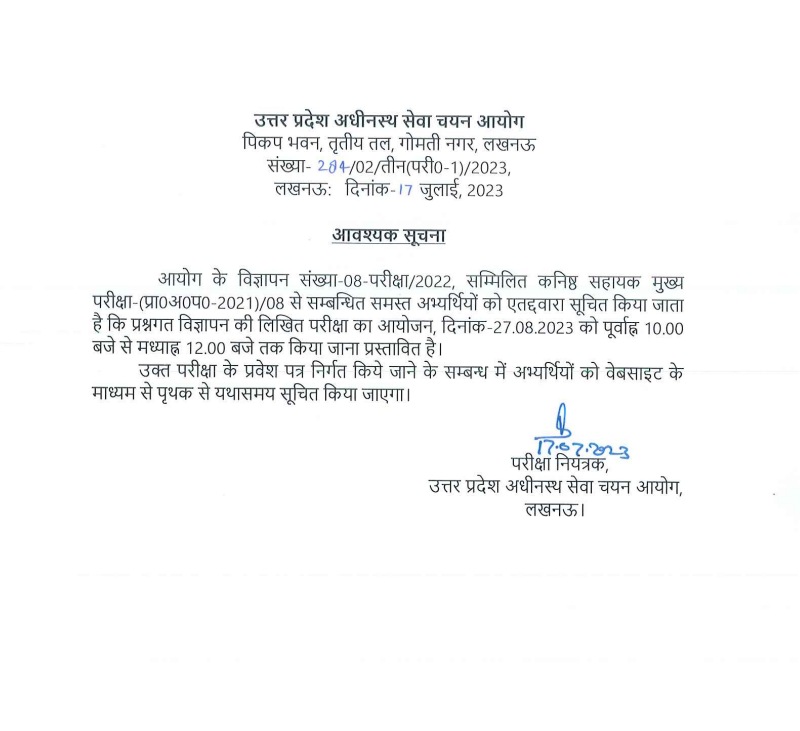 UPSSSC जूनियर असिस्टेंट मेन्स एग्जाम डेट नोटिस