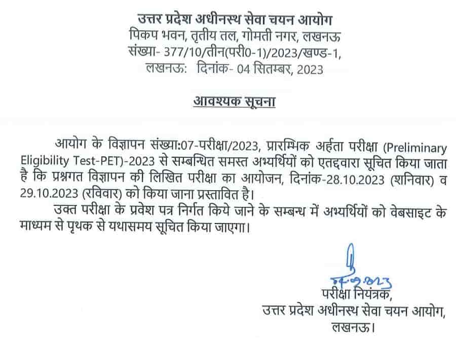 UPSSSC PET Exam 2023: The Uttar Pradesh Subordinate Service Selection Commission announced the dates of the Uttar Pradesh Preliminary Eligibility Test (PET) 2023 on 04 September. A notice has been released containing the details regarding the exam date. According to the official notice, the exam will be conducted on 28 October 2023 (Saturday) and 29 October 2023 (Sunday).