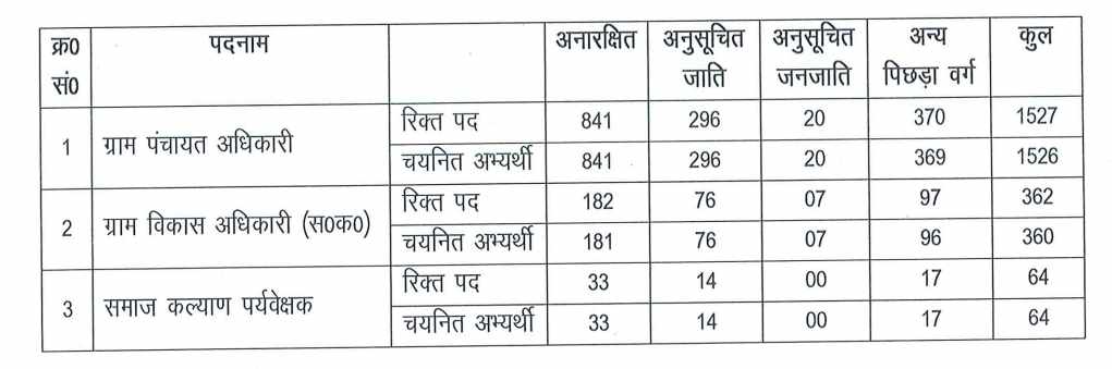 सूच्य है कि उक्त पदों के सापेक्ष पदवार, श्रेणीवार व अभ्यर्थियों द्वारा दी गयी वरीयता के आधार पर ग्राम पंचायत अधिकारी के रिक्त कुल 1527 पदों के सापेक्ष 1526 अभ्यर्थियों, ग्राम विकास अधिकारी (स0क०) के रिक्त कुल 362 पदों के सापेक्ष 360 अभ्यर्थियों व समाज कल्याण पर्यवेक्षक के रिक्त कुल 64 पदों के सापेक्ष 64 अभ्यर्थियों का अंतिम चयन परिणाम एवं तत्सम्बन्धी कट-ऑफ अंक को मा० आयोग द्वारा दिनांक 12.09.2024 को अनुमोदित किया गया है।"