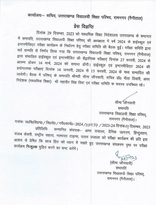 Check the Uttarakhand Board notice regarding the 2024 date sheet.