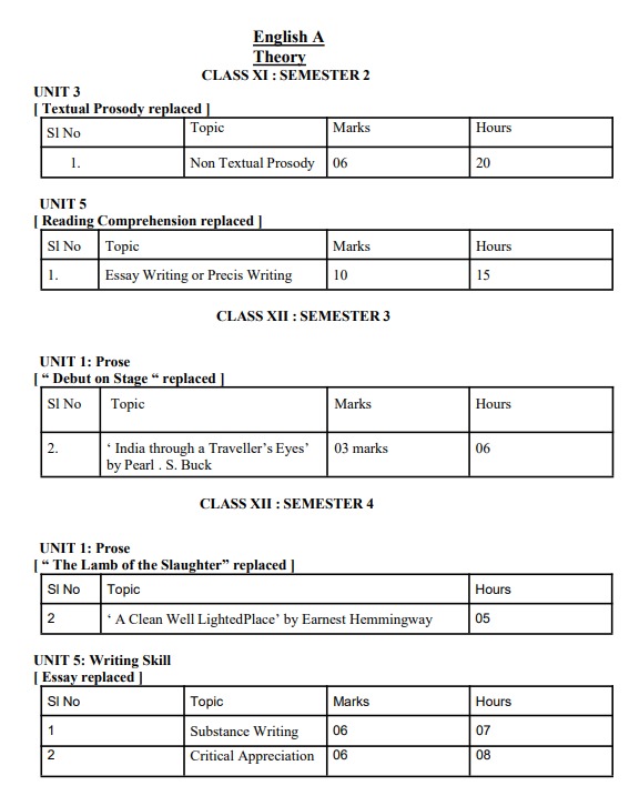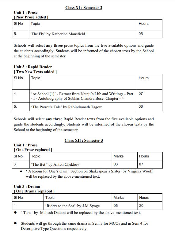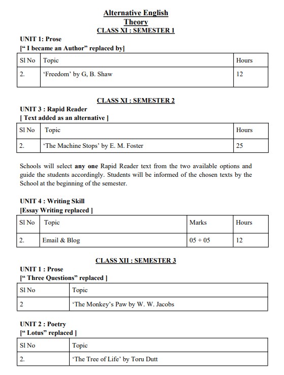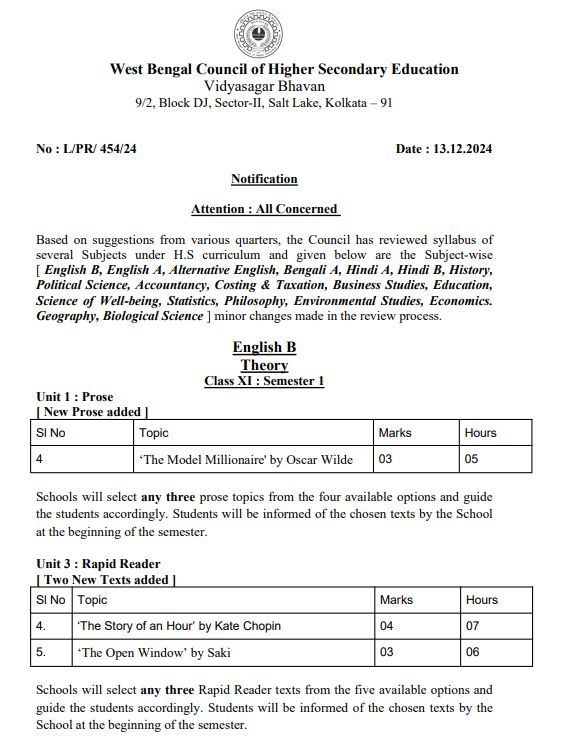 Complete List of Subjects with Syllabus Changes for WBCHSE Class 11th and 12th