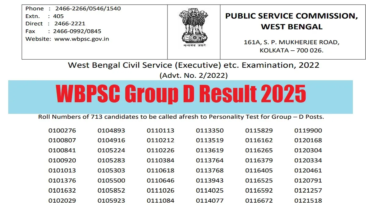 WBPSC Group D Result 2025 Out: The West Bengal Public Service Commission (WBPSC) has released the result for the West Bengal Civil Service (Executive) etc. Examination on its official website. A total of 713 candidates to be called afresh to Personality Test for Group – D Posts. The Commission has released the detailed interview schedule for the shortlisted candidates. The WBPSC Group D Result 2025 PDF has been uploaded on the official website containing the roll number of shortlisted candidates. The pdf of the qualified candidates for the West Bengal Civil Service (Executive) etc. Examination can also be downloaded directly through the link given below.