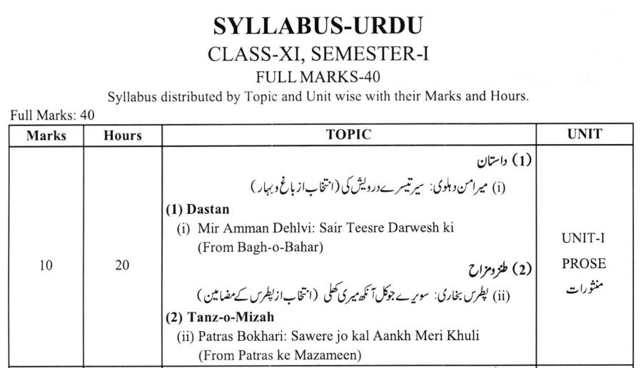West Bengal HS Class 11 Urdu syllabus 2024-25 for semester 1