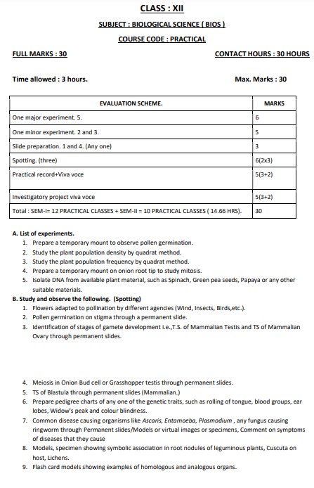 West Bengal Board Class 12 Biological Science Syllabus 2024-25