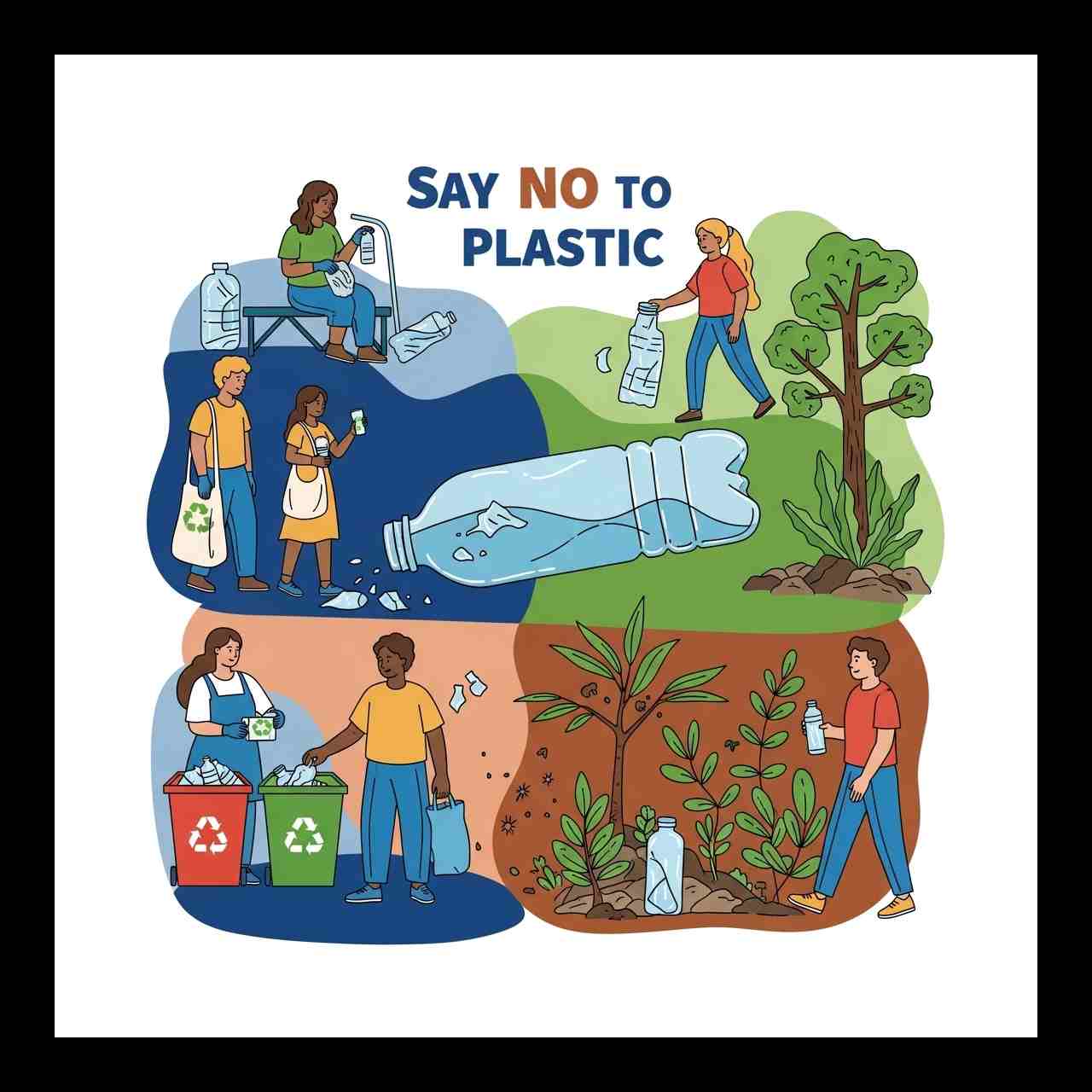 Image 6 - This dynamic illustration encourages "Say No to Plastic," showing diverse individuals adopting plastic-reducing habits and highlighting the positive environmental impact.