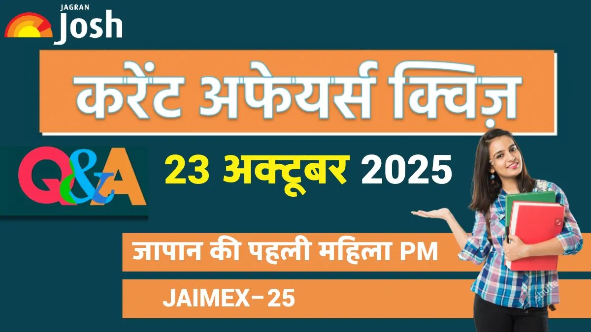 Current Affairs Quiz 23 Oct 2025: प्रतियोगी परीक्षाओं की तैयारी कर रहे विद्यार्थियों और जागरूक पाठकों के लिए जागरण जोश लेकर आया है इस सप्ताह का महत्वपूर्ण करेंट अफेयर्स क्विज. इस क्विज में जापान की पहली महिला PM, इंटरनेशनल कन्वेंशन अगेंस्ट डोपिंग इन स्पोर्ट, JAIMEX–25 से जुड़े सवाल शामिल हैं.