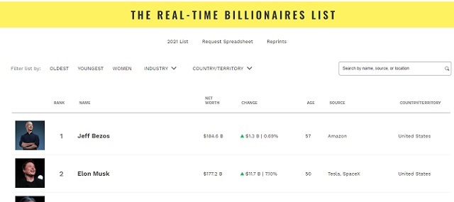 According to Forbes real-time billionaires list, Elon Musk remains at the second position behind Jeff Bezos with a net worth of around $177.2 billion, while Bezos has $184.6 billion.