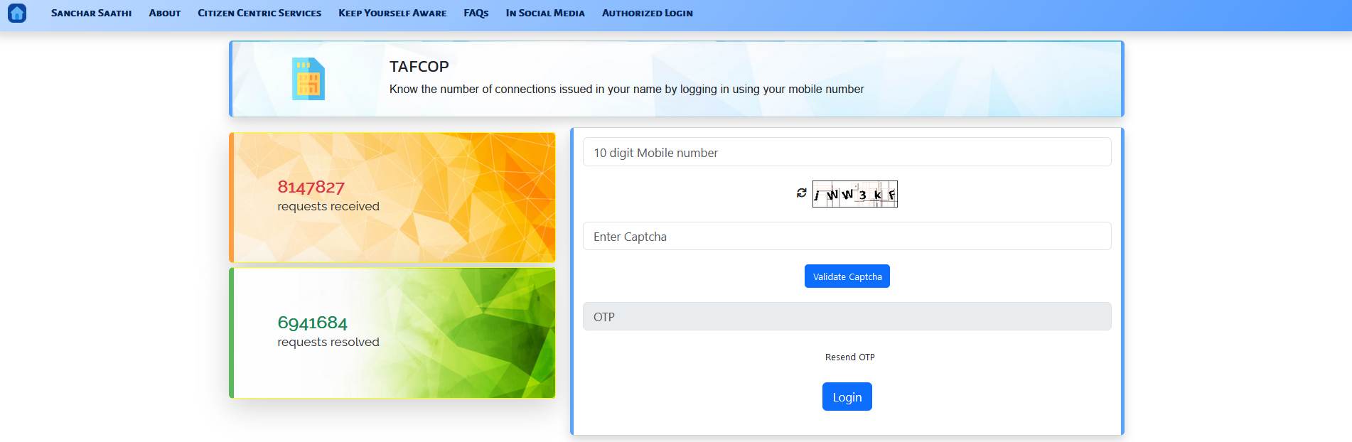 Step 1: Visit the official website of Sanchar Saathi or visit: tafcop.sancharsaathi.gov.in