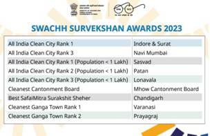 उत्तर प्रदेश के वाराणसी और प्रयागराज को सबसे स्वच्छ गंगा शहर के रूप में चुना गया है. मध्य प्रदेश में MHOW छावनी बोर्ड ने सबसे स्वच्छ छावनी शहर का पुरस्कार मिला. साल 2016 से स्वच्छ भारत शहरी मिशन के तहत केंद्रीय आवास और शहरी मामलों के मंत्रालय (MoHUA) द्वारा आयोजित स्वच्छ सर्वेक्षण, शहरी स्वच्छता और साफ-सफाई पर दुनिया का सबसे बड़ा सर्वेक्षण है.