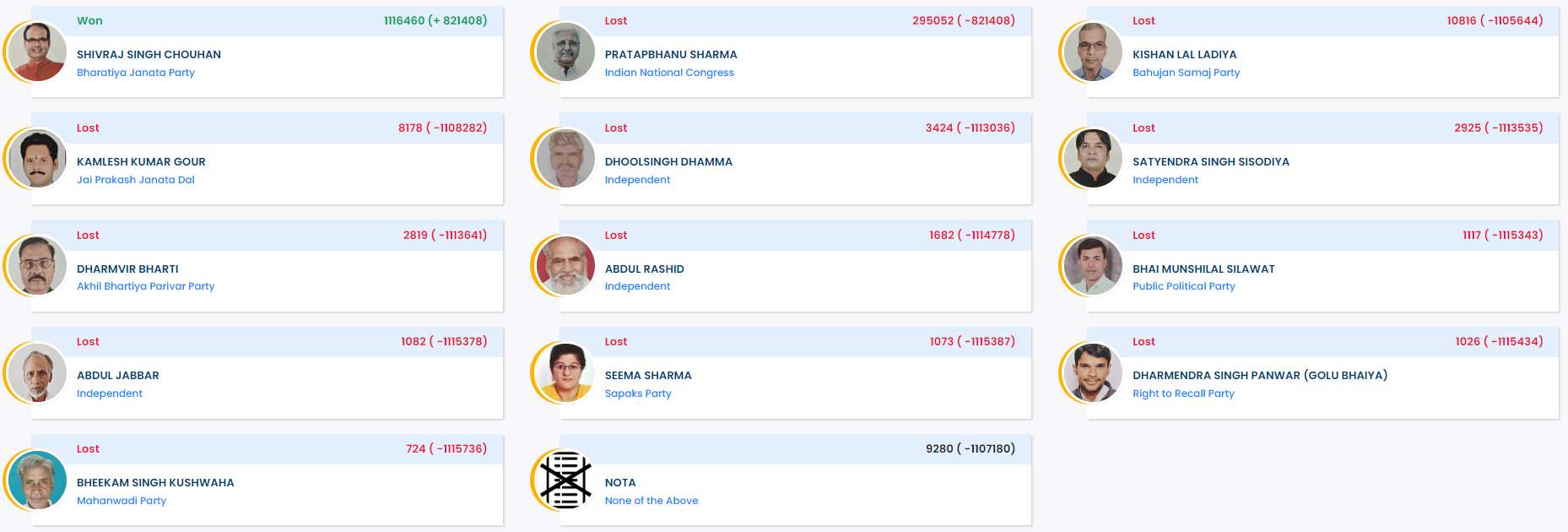 | 1 | SHIVRAJ SINGH CHOUHAN | Bharatiya Janata Party | 1111556 | 4904 | 1116460 | 76.7 |