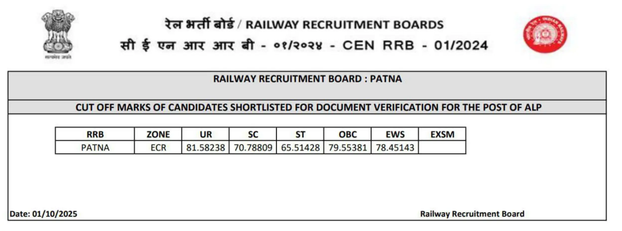 RRB ALP CBAT Cut Off 2025 Out