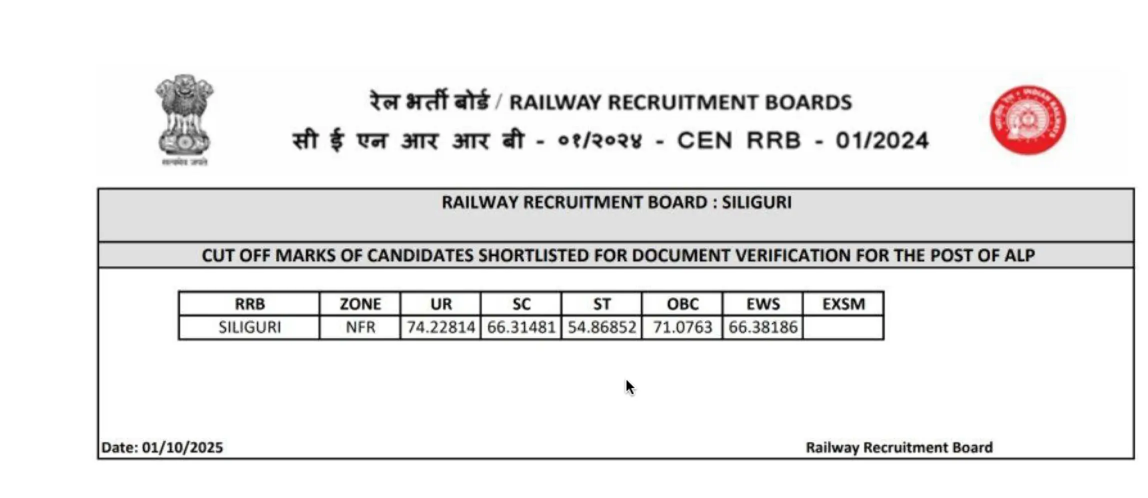 RRB ALP Siliguri CBAT Cut Off 2025