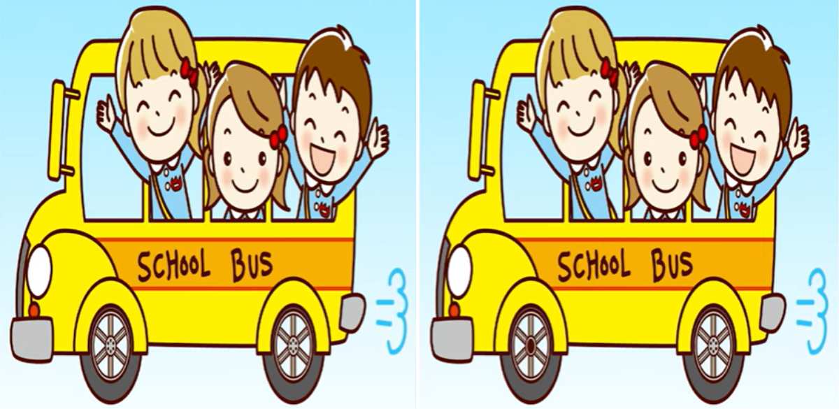 The image above depicts two identical pictures where you can see a school bus. There are three students, a boy and two girls, on the bus, waving goodbye. Although the images are nearly identical, there are 3 differences between them. Can you find them all in 21 seconds?