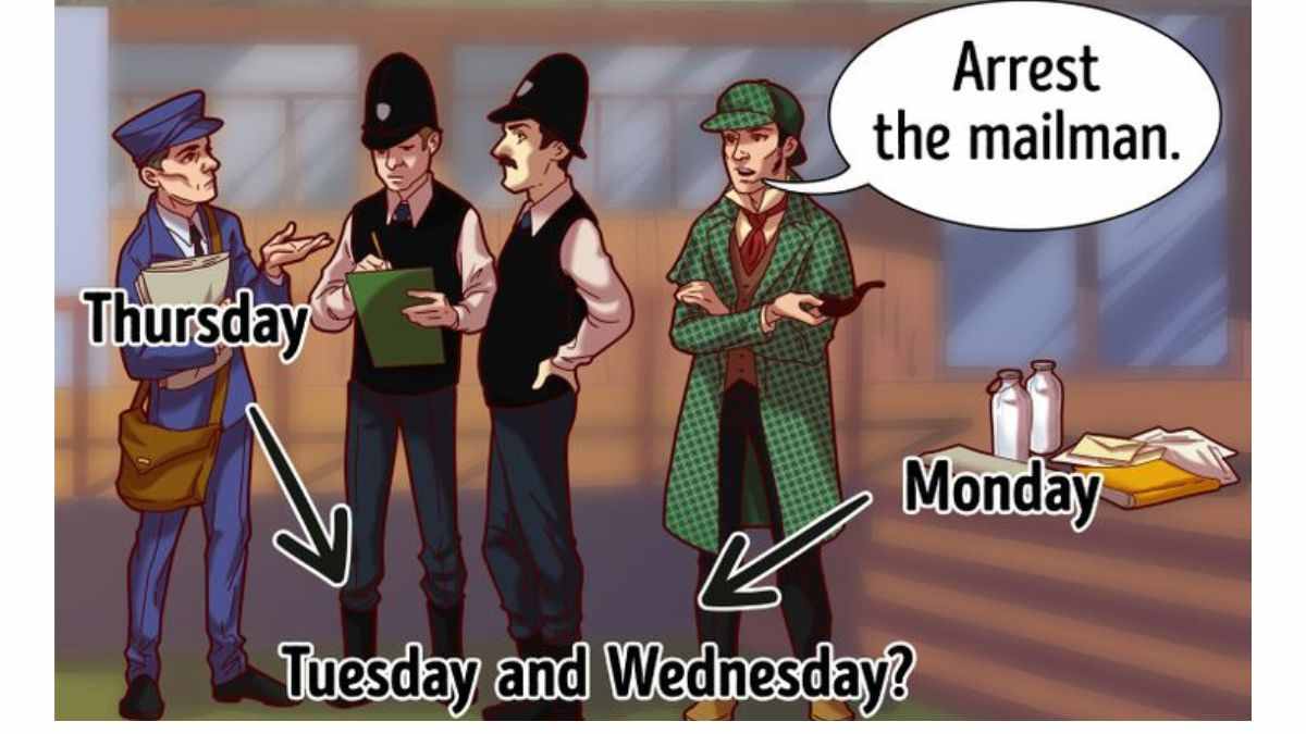 A wealthy man resides by himself in a modest cottage. He had everything brought to his cottage because he was disabled. On Thursday, when delivering a letter, the mailman discovered that the front door was slightly ajar. He could see the man's body lying in a puddle of dried blood through the aperture. Two milk bottles, the Monday newspaper, a catalogue, flyers, and unread mail were all on the porch. When Sherlock Holmes arrived at the cottage, he informed the authorities that the mailman was the murderer.