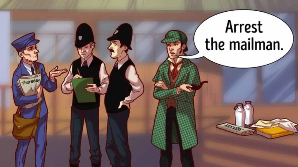The image shows a murder scene showing cops, mail man and Sherlock Holmes. And everyone believes the Mailman is the culprit. To prove this, go through all the sections to not miss any clues, and use skills like logical reasoning, observational power, and other abilities to conclude this mental exercise.