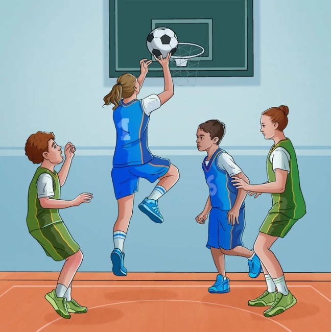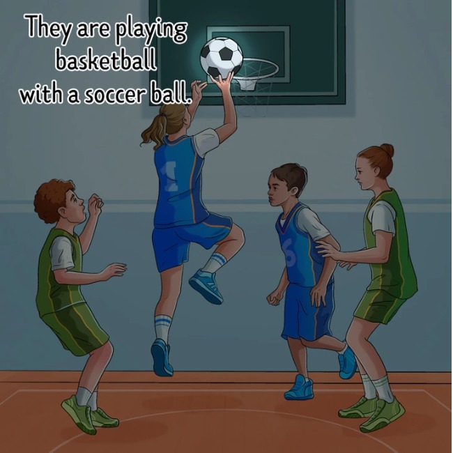 In this brain teaser picture puzzle, you can see a group of children playing basketball. The image may look normal, but it is not.