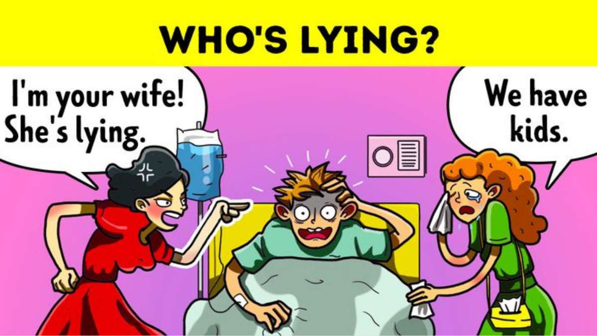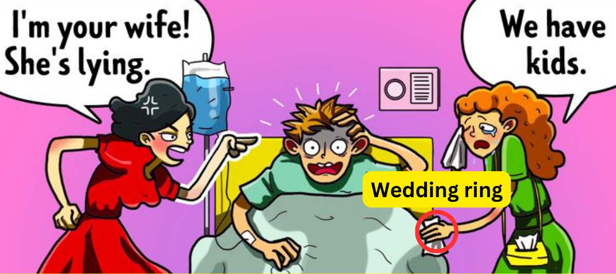In this brain teaser puzzle, you can see a man lying on a hospital bed with two women surrounding him. The man met with an accident a few days ago and went into a coma. After the accident, he forgot the details of his life and the people he knew, including his wife.