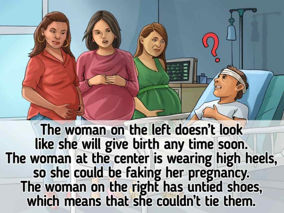 In the image above, you can see a man lying on a hospital bed. The man met with an accident a few weeks ago and then lost his partial memory. What he remembers is that he has a wife who is pregnant and due to give birth soon. Three pregnant women came to the hospital claiming to be the man’s wife. Can you find out who is the real wife? You have 5 seconds to solve this brain teaser puzzle. All the best.